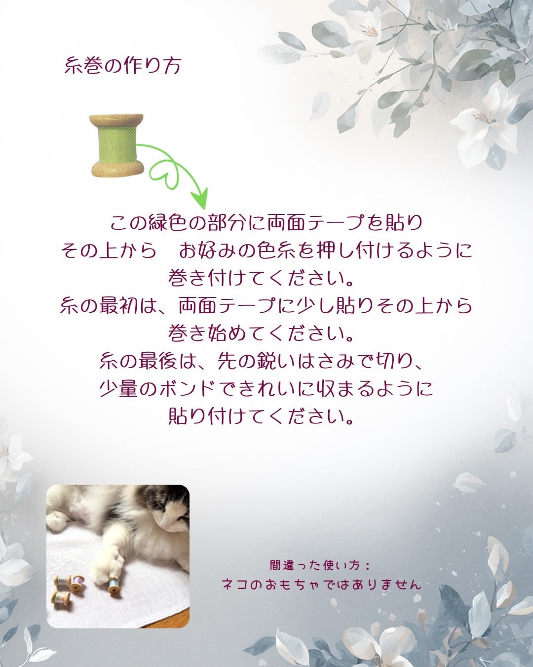 刺しゅうで使った糸をくるくる巻きつけて、